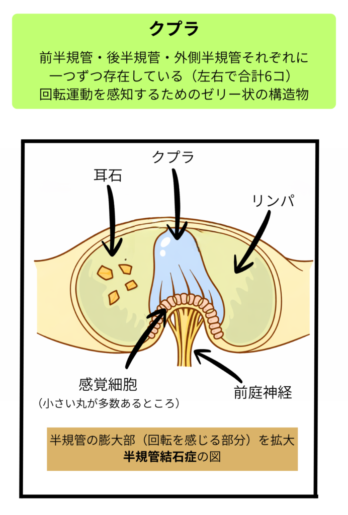 頭の位置が変わると、クプラ自体に耳石が付着していているので異常な刺激が発生し、それを脳に伝えてしまうため、めまいが生じます。