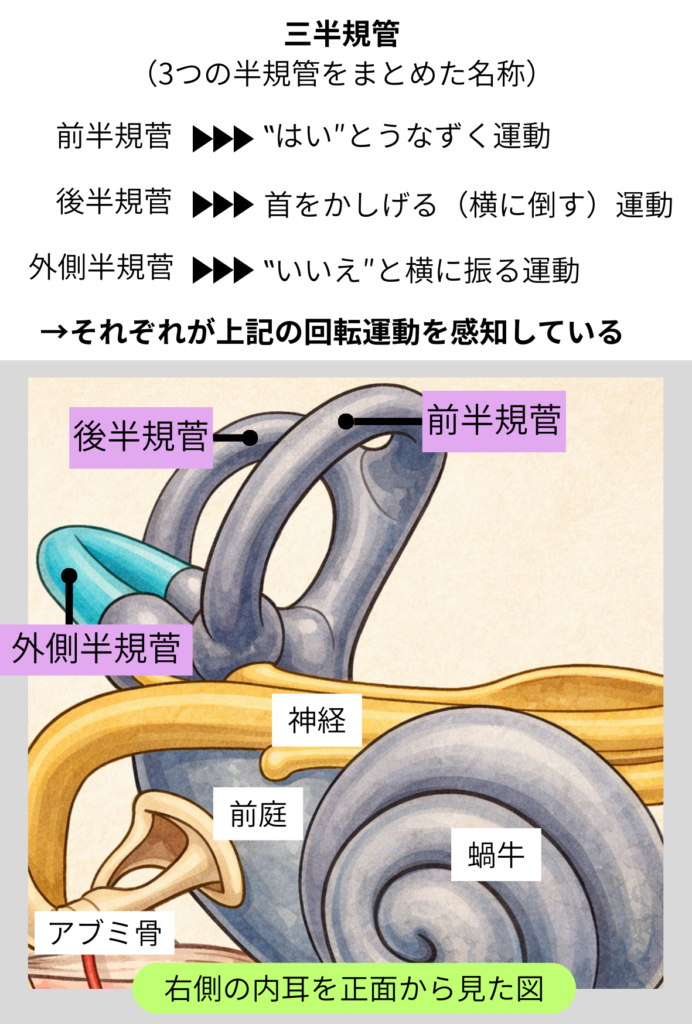どのくらいの勢いで動いているかを感知するための構造の一部として前庭での平衡感覚に欠かせない大事な役割を持っています。